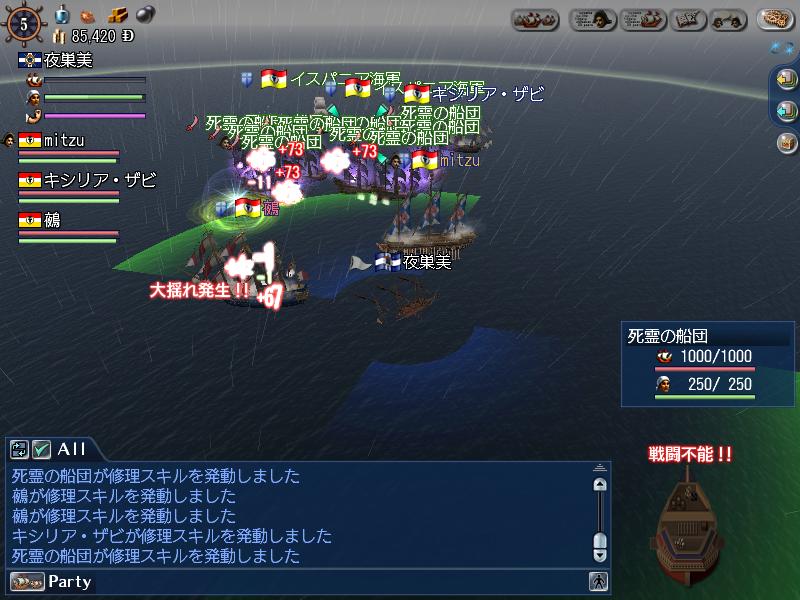 砲撃は全くやってないので、取ってそれっきりの水平射撃R1がすぐ効果なくなるぜ!後できちんと育ててやらないとなぁ(´Д`)あとやっぱり統率、帆、外科などが出来なかったんですよね。F8押す→開くまで少々時間がみたいな感じで。修理も連打にはなるのですが、なんていうか・・・これは多分グラボのせいというよりも、私がF8が開いてすぐ外科とかっていう動きやタイミングに慣れてなかったのが原因かな~って思います。